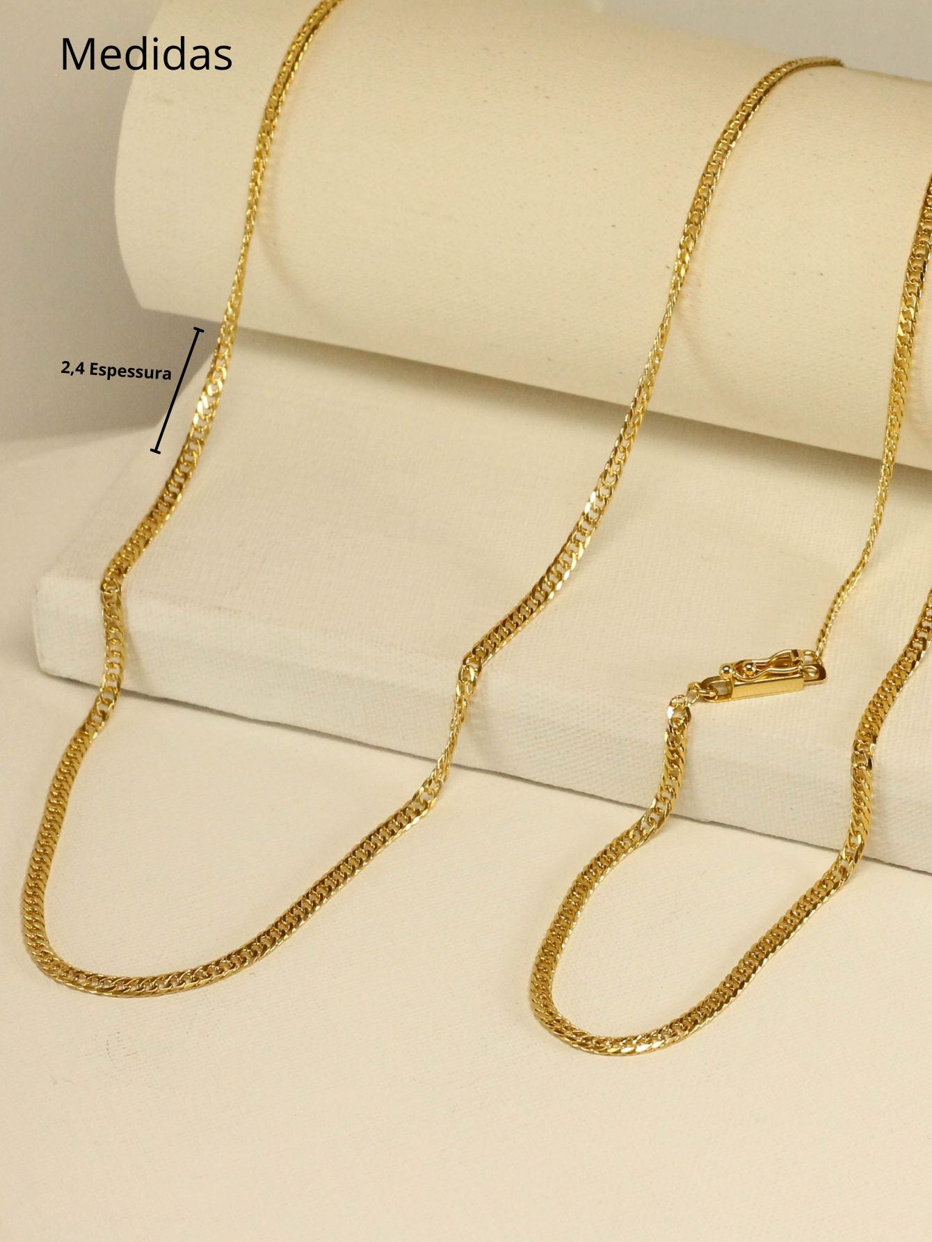 A corrente recebe um verniz especial que aumenta a resistência à oxidação, mantendo sua beleza e brilho por mais tempo.