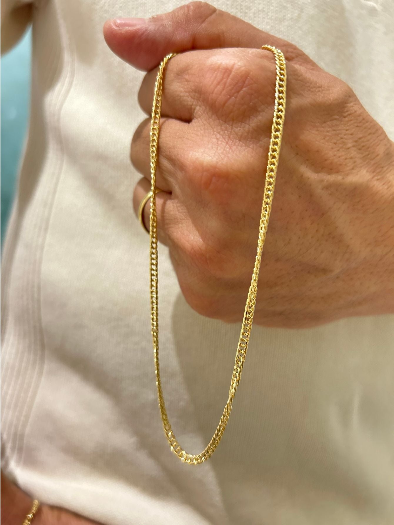 Além do verniz, o processo de banho com ouro 18k ou prata 925 reduz significativamente a oxidação, garantindo que a corrente permaneça impecável.